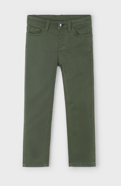 These boys' slim fit twill pants are designed for both comfort and durability. Featuring a zip and button closure, they also include an adjustable elastic waistband with interior buttons for a customized fit. Made from resilient twill fabric, these pants are perfect for everyday adventures. They include sustainable trims and feature multiple pockets for added functionality. Part of our Mayoral Basic collection, this essential piece is a must-have for any wardrobe. For safety reasons, smaller sizes (2-5 years) will have a mock fly instead of a functional zipper.