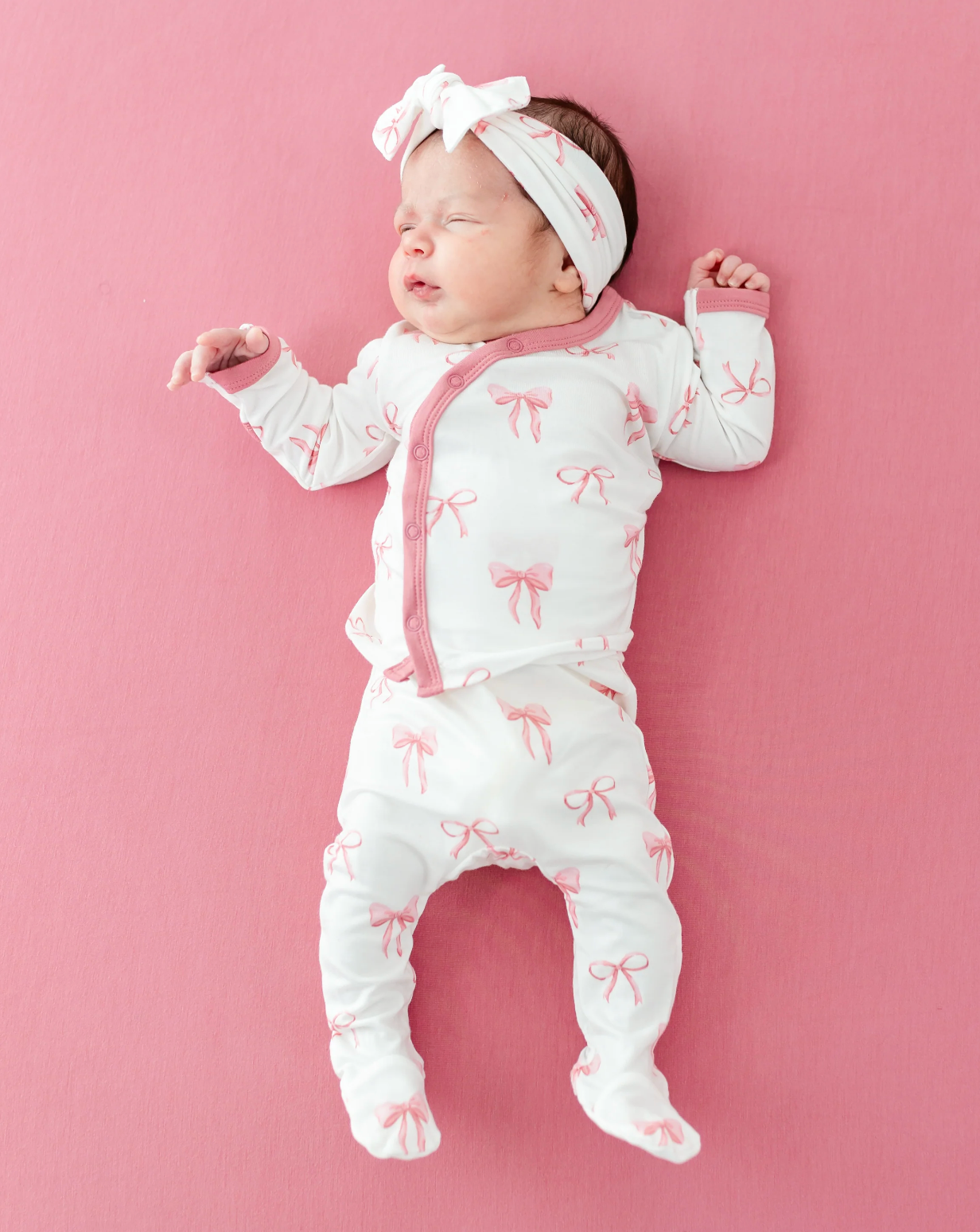 Welcome your newborn with the perfect outfit to mark the occasion. This ultra-soft set features a kimono style top that’s gentle and non-irritating on your baby’s umbilical cord stump, footed pants to cover those tiny toes, and a stretchy bow to add the sweetest touch to an adorable coming-home look.