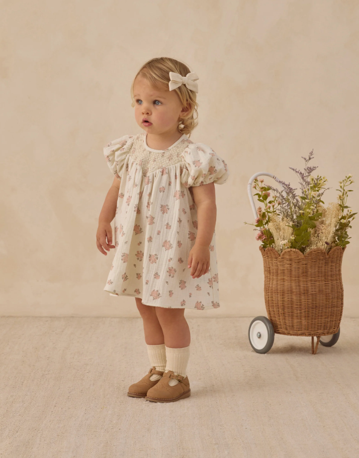 Babydoll dress with sweet bubble sleeves and beautiful diamond smocking around the neckline. Designed with buttons at the back for easy changes. Coordinating bloomers included with all sizes.
