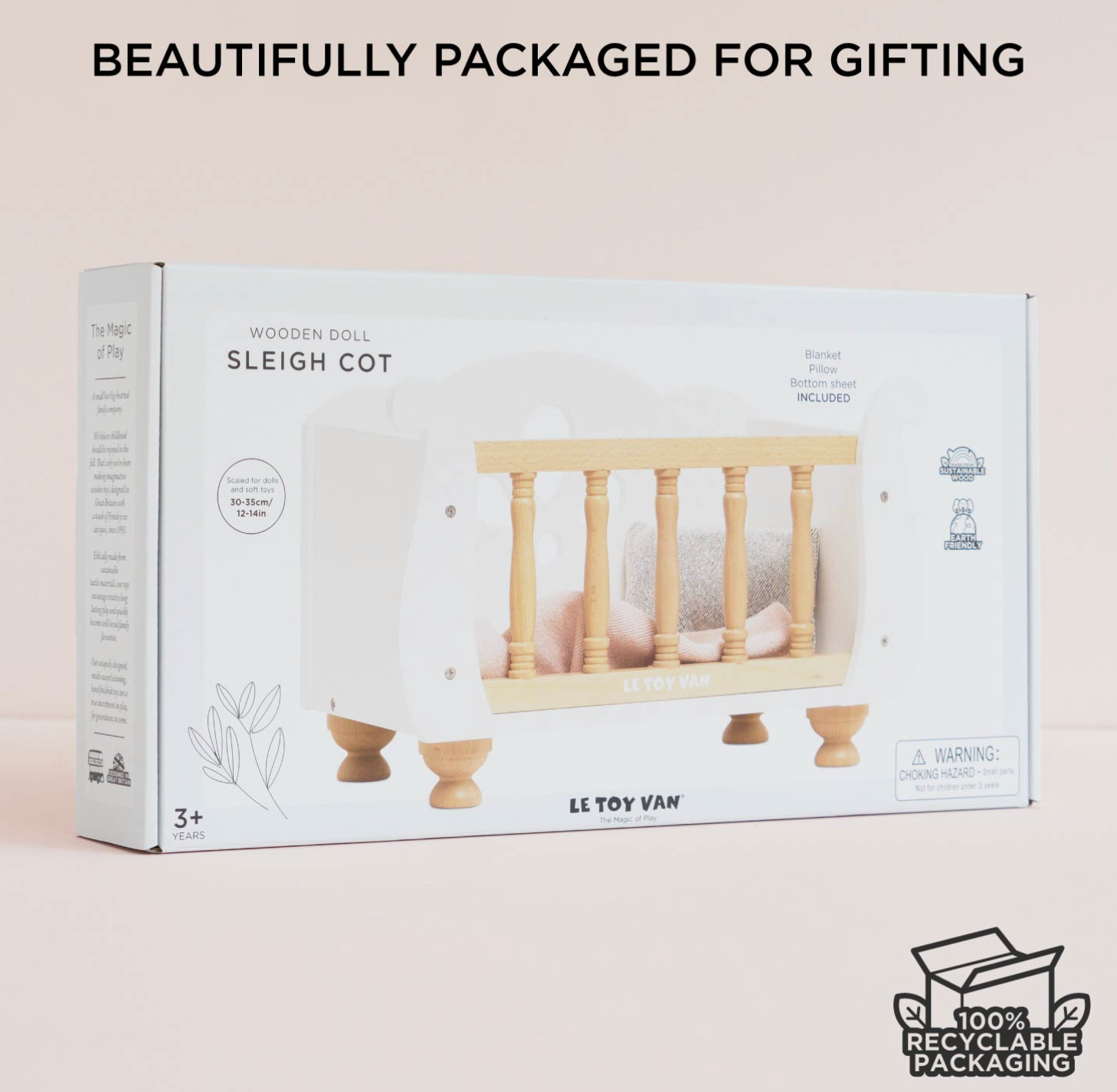 The prettiest toy cot, just perfect for pretend play adventures. This stunning toy is crafted from sustainable FSC®-certified wood - built for day after day role play fun and kinder to our planet too. With its beautiful, traditional design and cute turned wood details, this crib looks a treat in the nursery or playroom. Perfectly sized for dolls and soft toy friends up to 30-25cm 12-14in. This beauty comes complete with a sweet bedding set comprising a soft fabric pillow, blanket and bottom sheet in shades of pastel pink, creams & greys. A wonderful educational toy and heirloom gift to treasure and pass down through the years. -Suitable for ages 3 years+ -Made of FSC®-certified wood -Decorated with non-toxic, water-based resistant paints