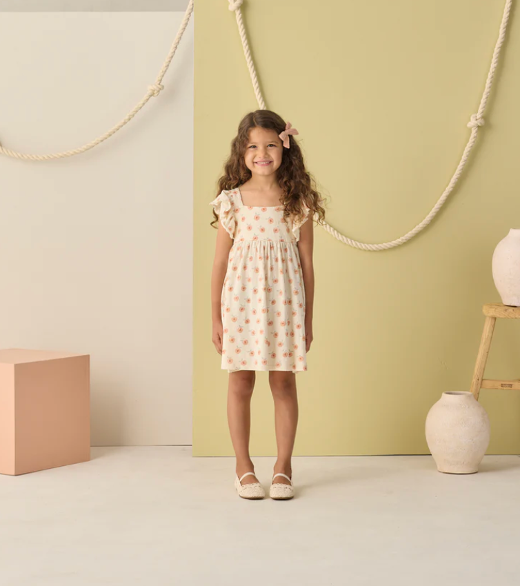 Our Mariposa Dress is a mini dress featuring short butterfly-style sleeves and coconut buttons down the back. This lightweight style is perfect for warm summer days.