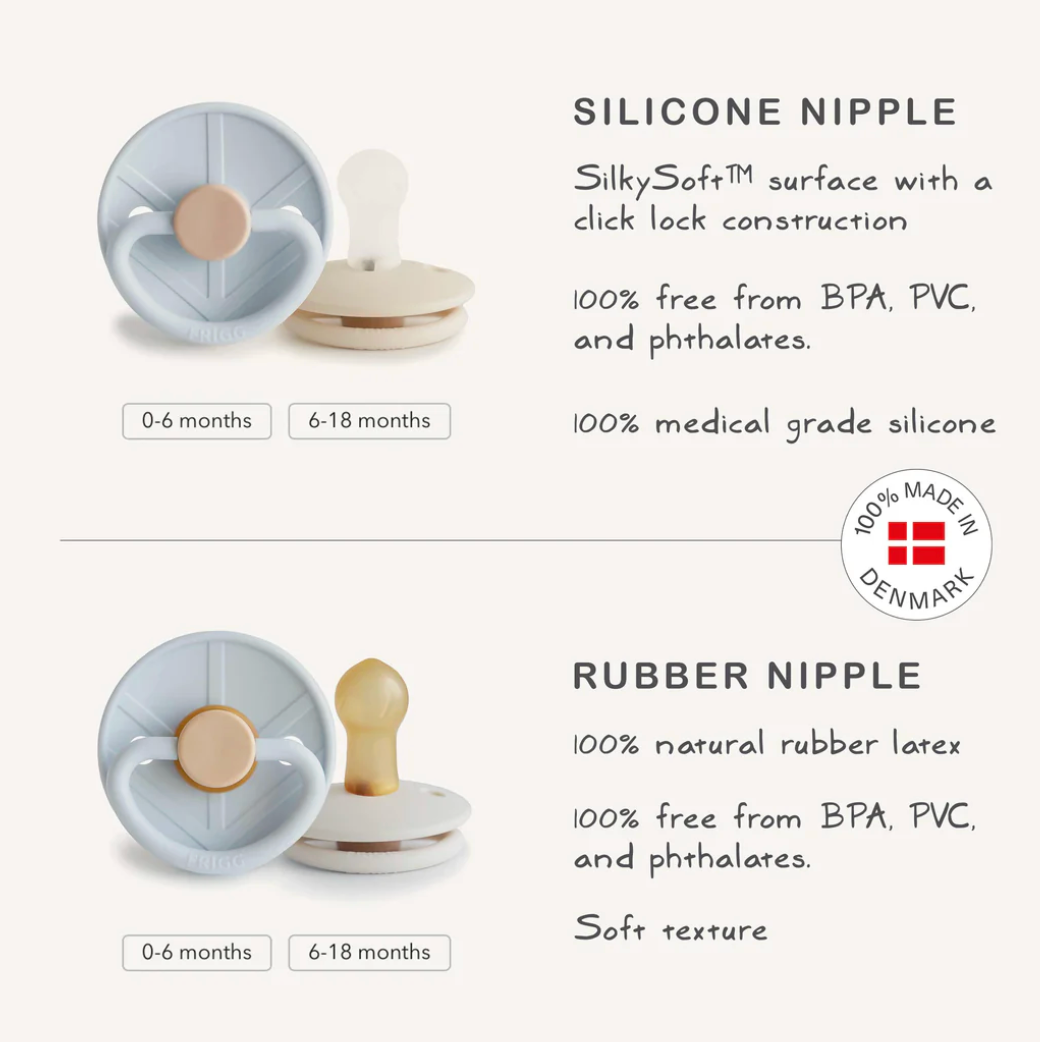 The FRIGG line of Little Viking rubber pacifiers is inspired by Norse mythology, including The FRIGG line of Little Viking rubber pacifiers is inspiredthe Norse Goddess Frigg, who is the inspiration behind the FRIGG brand. Designed and made in Denmark, FRIGG's rubber pacifiers feature a natural rubber latex nipple and patented Click-Lock® system for added comfort and safety. The outward curve keeps the pacifier off baby's delicate skin, while air holes and a security handle give parents extra peace of mind.