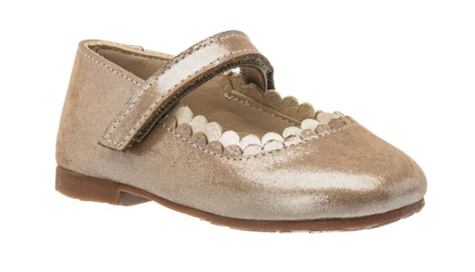 First steps in style. This ballerina in shiny blush leather with a silk-like texture is as elegant as it is functional. Featuring a delicate scalloped trim and an easy hook-and-loop strap, it's designed for toddlers learning to walk. With no reinforcements at the heel or toe, the shoe adapts like a second skin ultra-light, flexible, and soft, it s the perfect blend of beauty and barefoot comfort.