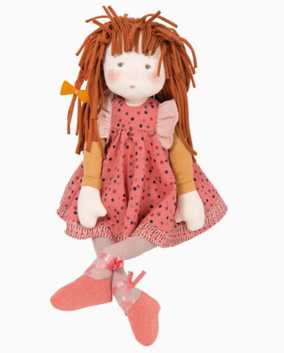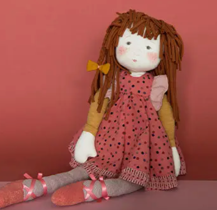 Anémone is a large sized rag doll with a soft face delicately illustrated and printed, and long red hair in rolled jersey. She wears a pink dress with multicolored polka dots and ruffles on the shoulders. Ready for ballet, she has point shoes with with satin ribbons.
