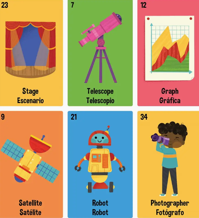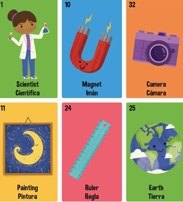 A Bilingual Picture Word Bingo Game A bilingual English-Spanish bingo board game that introduces little ones to STEAM-themed vocabulary words. Our best-selling bilingual board game is diving into the innovative and creative world of STEAM! Inspired by the oldest traditional game of chance and our widely adored Lil’ Lotería series and games, Lil’ Lotería: My First STEAM Words is a marvelous twist on the classic bingo game turned into a bilingual memory and matching activity. While playing, little ones will learn memory and matching skills and STEAM-themed vocabulary words in both English and Spanish! Parents will rave over this educational bilingual English-Spanish board game and its ability to strengthen brain function while bridging together two languages to explore the STEAM universe. Comes with: 6 game boards & 36 playing cards 36 Pages Juvenile Nonfiction / Concepts / Words /Ages 3 And Up
