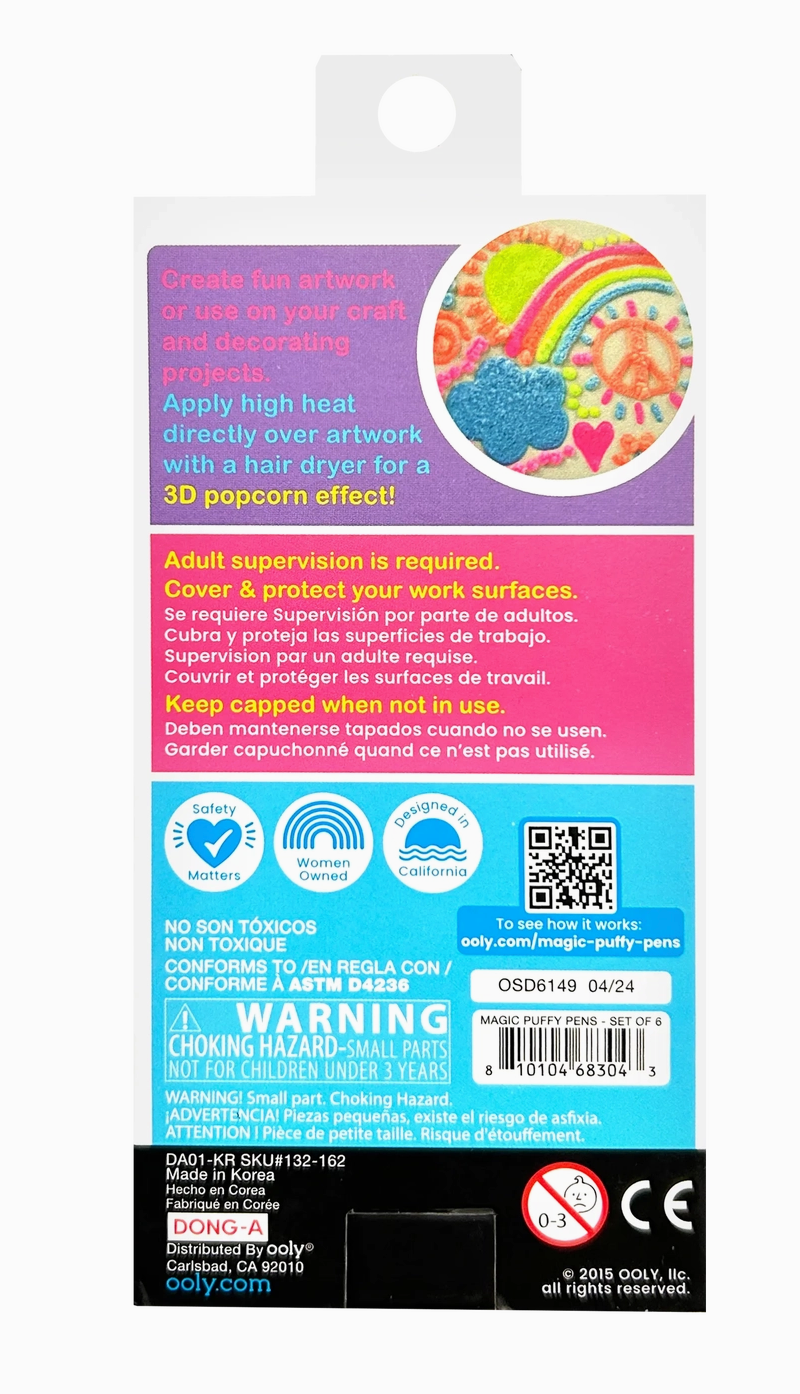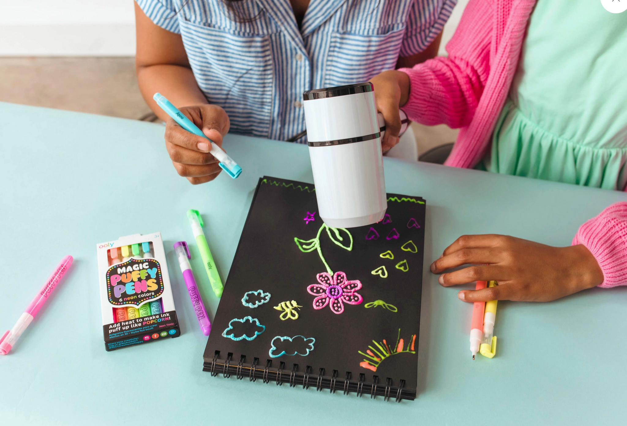Magic Puffy Pens are a very special set of neon colored pens that puff up with 3D magic when you apply heat. It's all in the magic ink. 3D Puffy Ink Pens Makes Your Art Puff Up When You Apply Heat Great for Unique Art Projects Set of 6 Neon Colors Suitable for ages 3 and up- Adult Supervision is Required