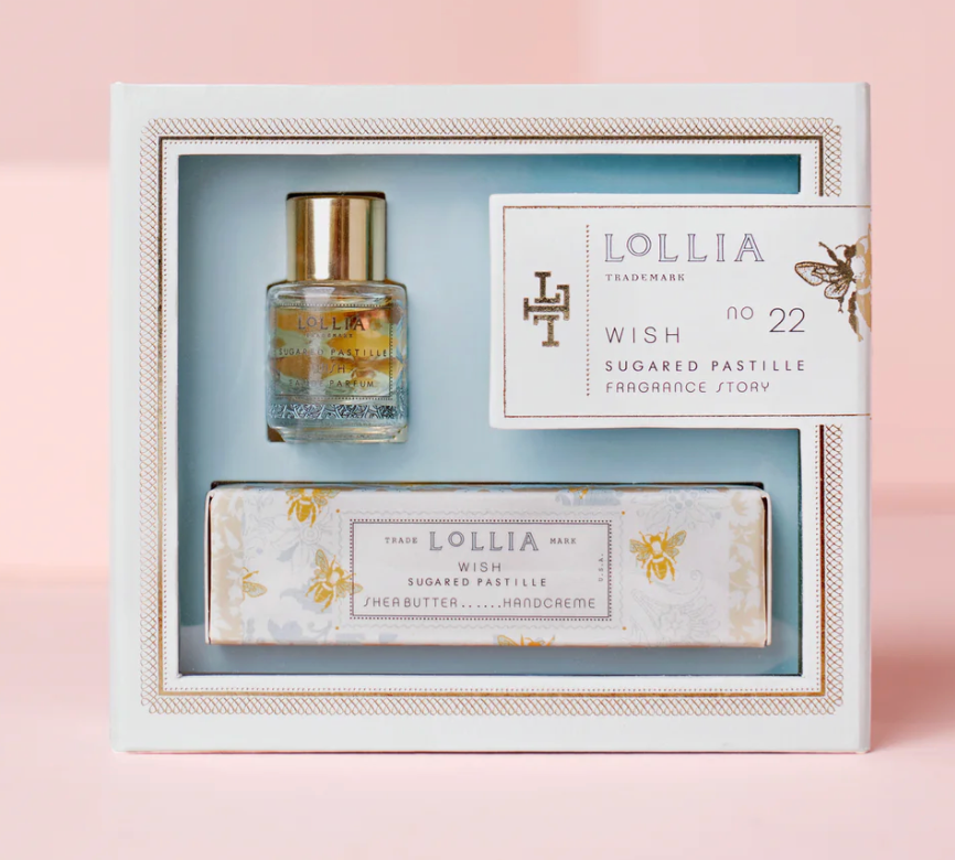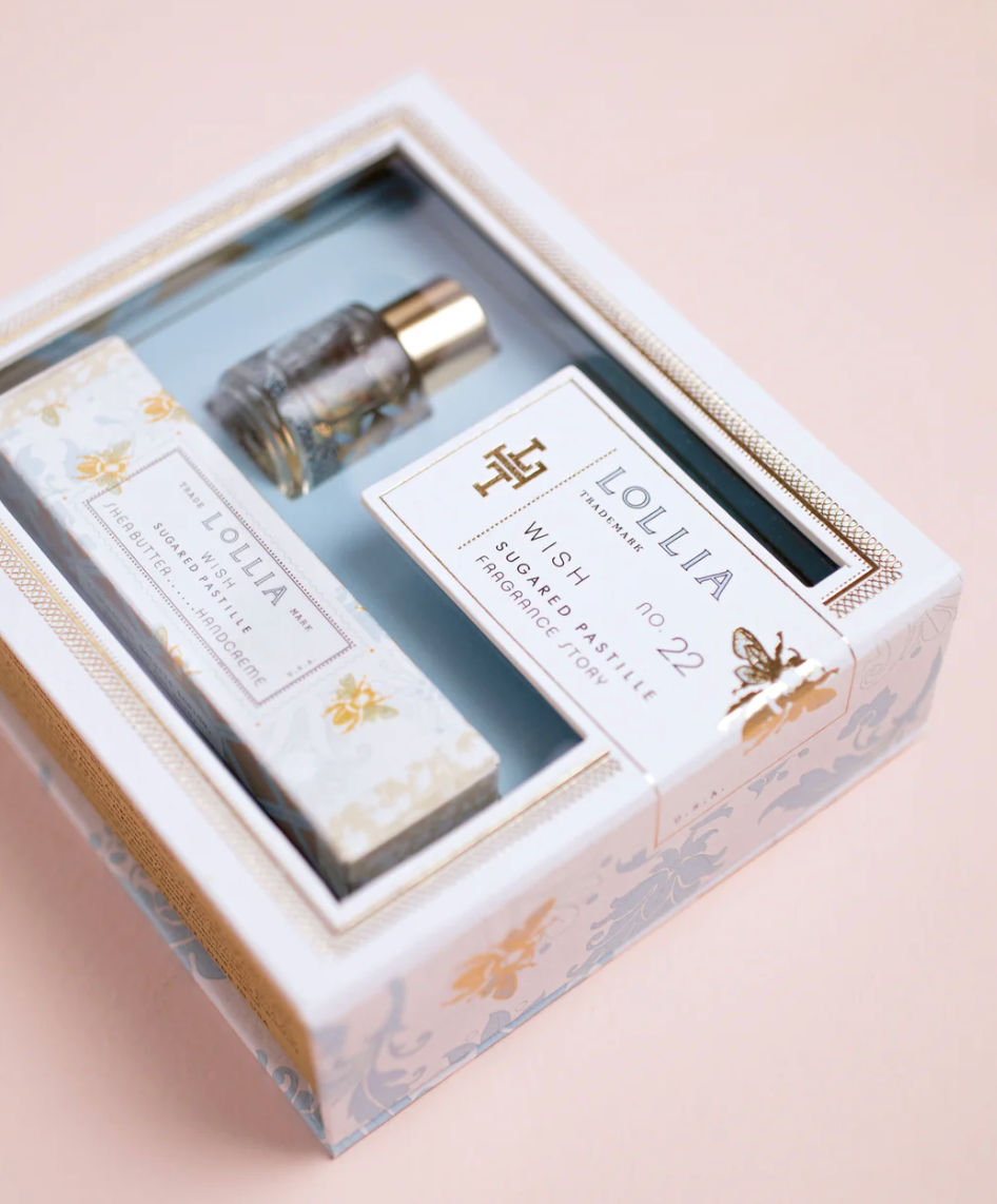 Elevated gifting. Nestled inside an elegant keepsake gift box glowing with golden accents and sophisticated detailing. So beautiful you can even forego the wrapping.Includes, in a Gift Box1 Wish Little Luxe Eau de Parfum1 Wish Petite Treat Handcreme