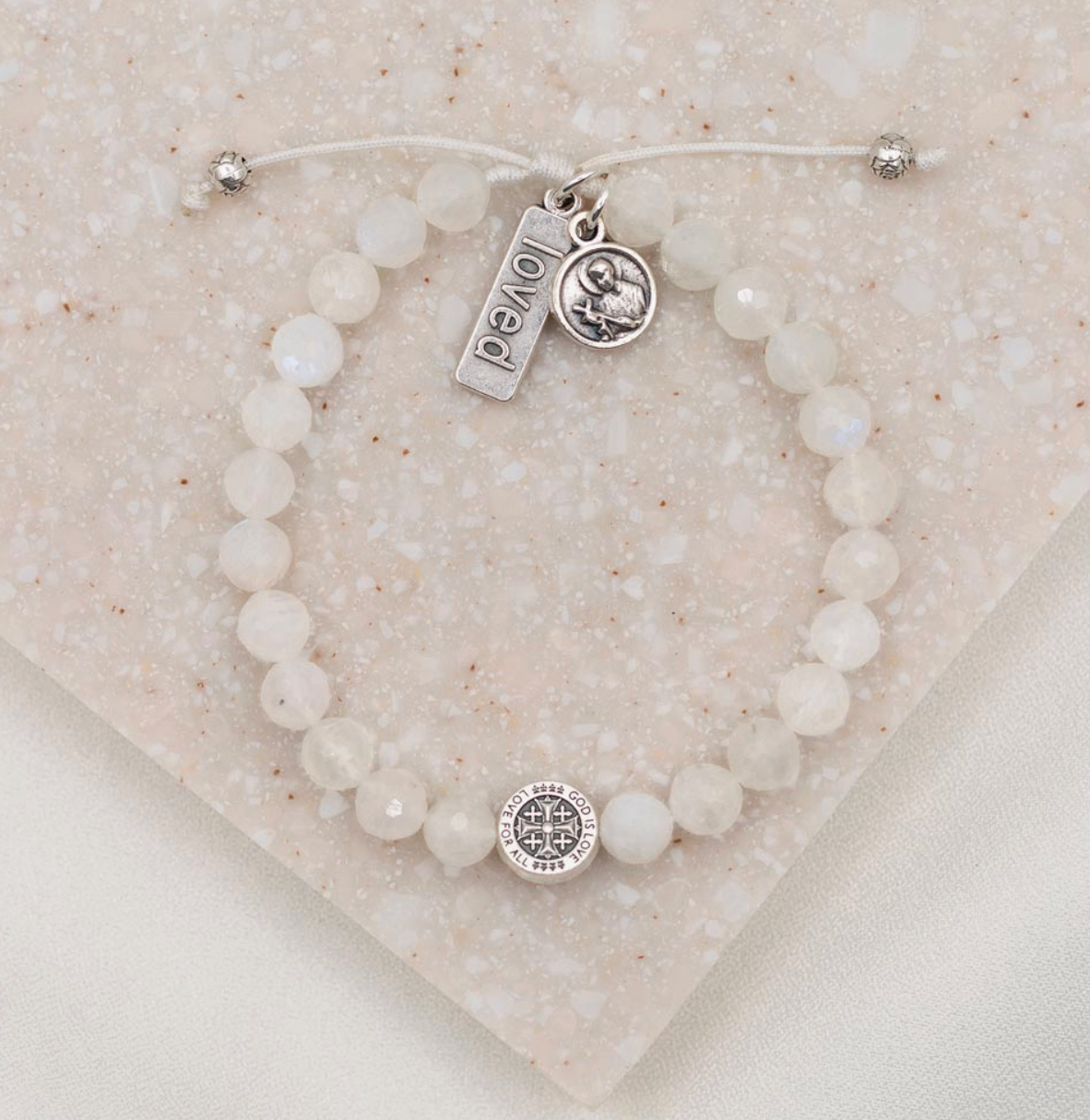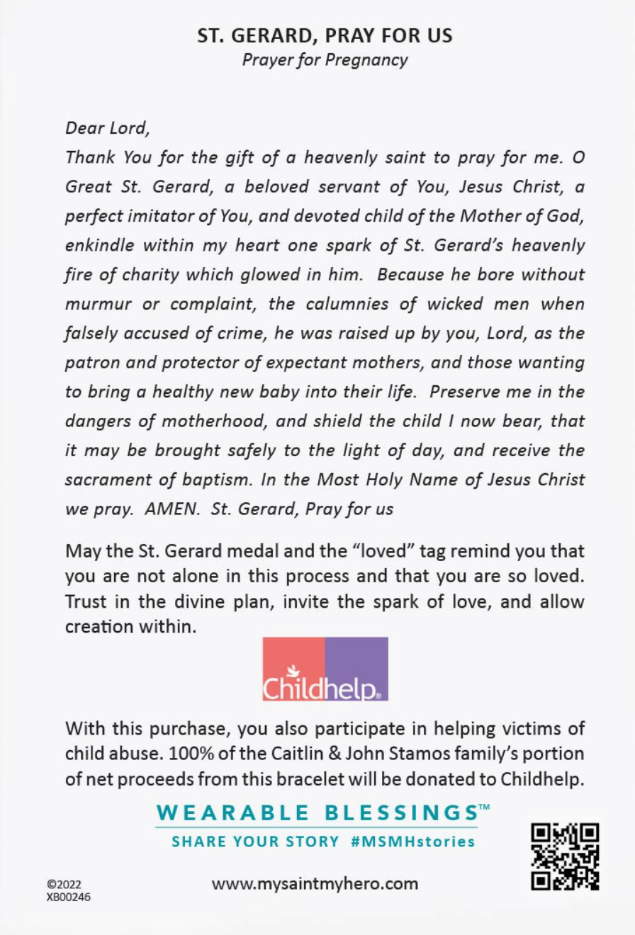 Wear this bracelet in celebration of new life, as you invite the spark of love and the creation of life within. May you be surrounded by all the blessings from heaven and earth. St. Gerard is your heavenly saint—he is the patron saint of fertility and healthy pregnancies.With your purchase of this St. Amos Blessing Bracelet, you also participate in helping victims of child abuse. 100% of the Caitlin & John Stamos family’s portion of net proceeds from this bracelet will be donated to Childhelp fo.