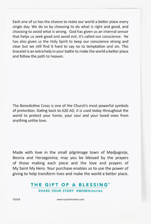 Our First Communion Blessing Bracelet is handwoven in Medjugorje, Bosnia and Herzegovina Features silver-tone and gold-tone Benedictine medals and our signature "blessed" tag. Medals hand-cast in a sacred site in Italy Each bracelet comes on a special First Communion card The sliding slip knot closure enables the bracelet to fit nearly all children ages 5 and up. 8.5" when fully opened