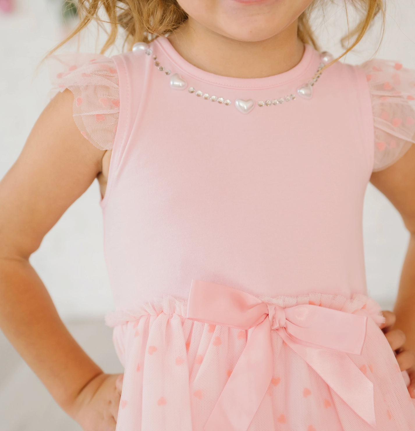 This pink tiered tutu dress sparkles with heart and gem necklace details and layers of ruffled tulle sprinkled with tiny hearts — perfect for twirls, tea parties, and all her happiest days.